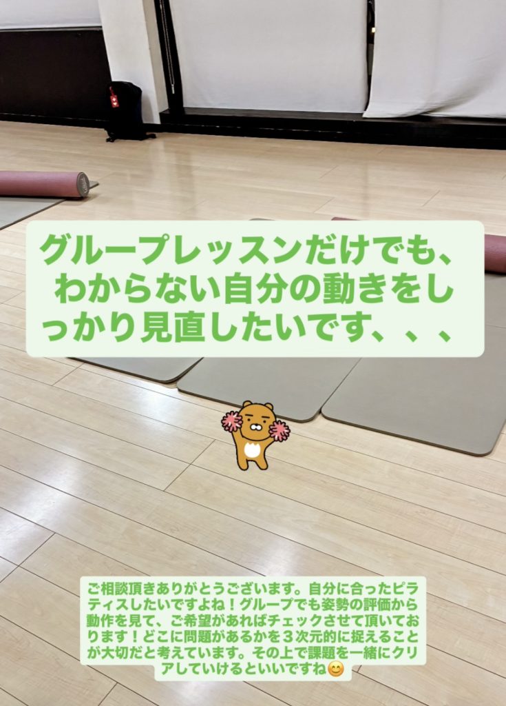 ご相談頂きありがとうございます。自分に合ったピラティスしたいですよね!グループでも姿勢の評価から動作を見て、ご希望があればチェックさせて頂いております!どこに問題があるかを3次元的に捉えることが大切だと考えています。その上で課題を一緒にクリアしていけるといいですね