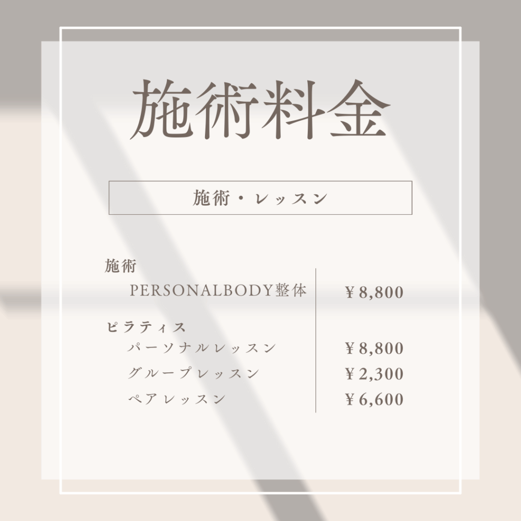 当スタジオ限定。初回60分2回目以降40分の施術!問診や検査測定などを行って状態を把握し、その方にあったマッサージ、ストレッチ、施術、トレーニング、ピラティスなどを行います。痛みなど不調があって運動がしにくい方向けのメニューです!通常レッスン 1回8800円 初回割引 3か月、6か月コース割引などがございます。